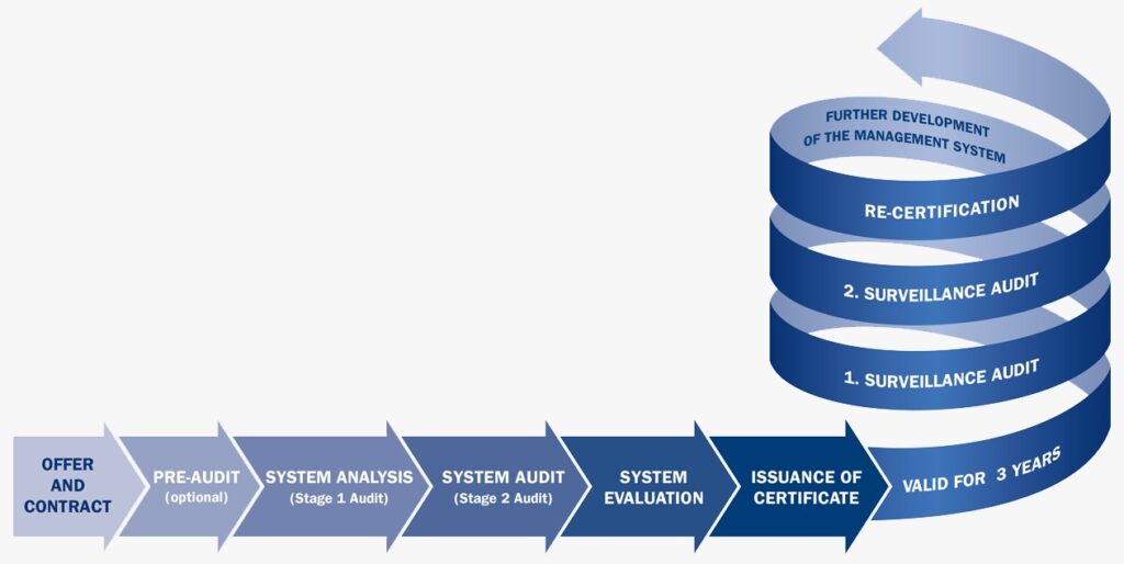 Global Management Systems Registration (GMSR) provides Management System Certifications to other businesses. An ISO certificate is usually valid for three years. Since certification is a snapshot, a surveillance audit is carried out every year. The main focus here is on management and improvement processes. Before the certificate expires, a “recertification audit” must be carried out to maintain its validity. We offer ISO 9001, ISO 14001, ISO 45001, ISO 22000, ISO 27001, ISO 13485, ISO 37001, ISO 21001, ISO 20121, ISO 22301, ISO 28000, ISO 31000, ISO 39001, ISO 29990, ISO 50001, ISO 22716, ISO 3834, FSSC 22000, HACCP, HALAL & many more.